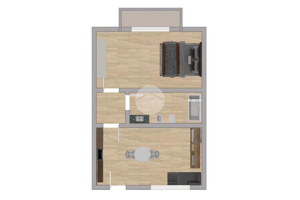 L’appartamento si apre su una accogliente zona giorno con cucina a vista, uno spazio funzionale e ben organizzato, ideale per la vita quotidiana. Un comodo disimpegno conduce alla camera da letto, che gode di un balcone di pertinenza, perfetto per un momento di relax all’aria aperta. Completa la soluzione il bagno.