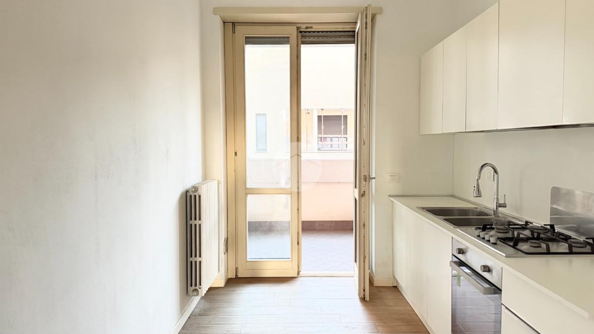 La cucina separata, funzionale e ben organizzata, gode di un ulteriore sfogo esterno grazie al balcone dedicato.